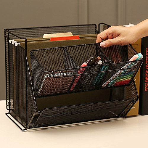 There is a compartments for files and folders and a removable compartment with 3 slots for post-it notes, staples, erasers, white out, and other work supplies
