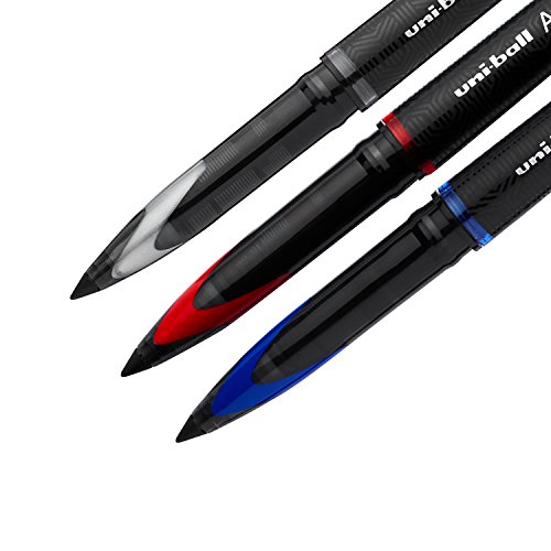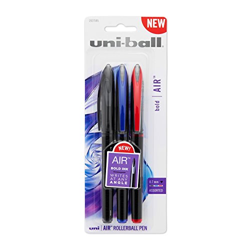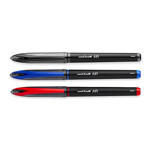 Unique tip delivers smooth, scratch-free writing at any angle. SmartTip technology and uniquely designed roller ball tip allows free flowing ink to glide smoothly across the paper for completely skip-free, scratch-free writing. It varies the amount of ink it lays down based on the pressure and angle, so you can write bold or fine lines instantly and easily. Fountain pen-inspired design gives the pen a premium feel. It writes soft like a marker but is durable like a rollerball. Writes at any angle and adjusts to your specific writing style and gets better over time. Translucent cap indicates ink color. The barrel is sleek silver with sophisticated decoration and a unique, glassy plastic clip. Available in black, red and blue. uni-ball Air Rollerball Pen, 3-Pack, Complete, Assorted Colors (1927595).