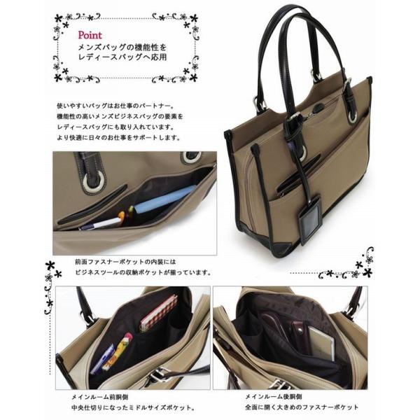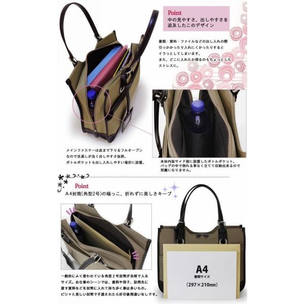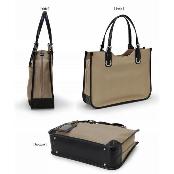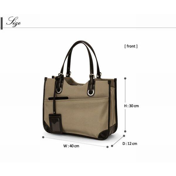 メンズビジネスの機能性を女性目線の使いやすさに応用したお仕事用トートバッグ。 ●本体サイズ:幅40x高30x行12(cm) ●本体重量 :約920g ●仕様 :【外側】・オープンポケット(ミニサイズ)×1・ファスナーポケット×1・ファスナーポケット内装にオープンポケット×2、ペン差し×2 【内側】・ボトルポケット×1・オープンポケット×2・ジッパーポケット×1 |