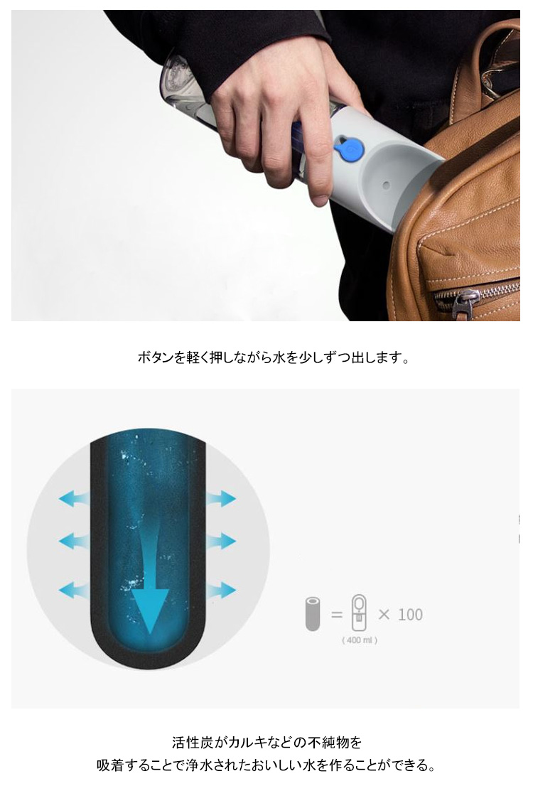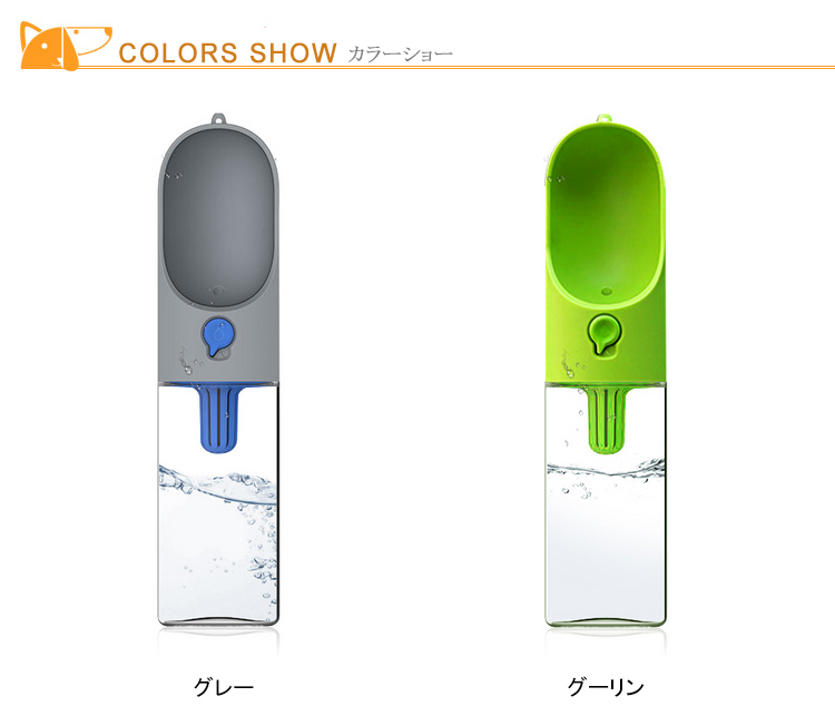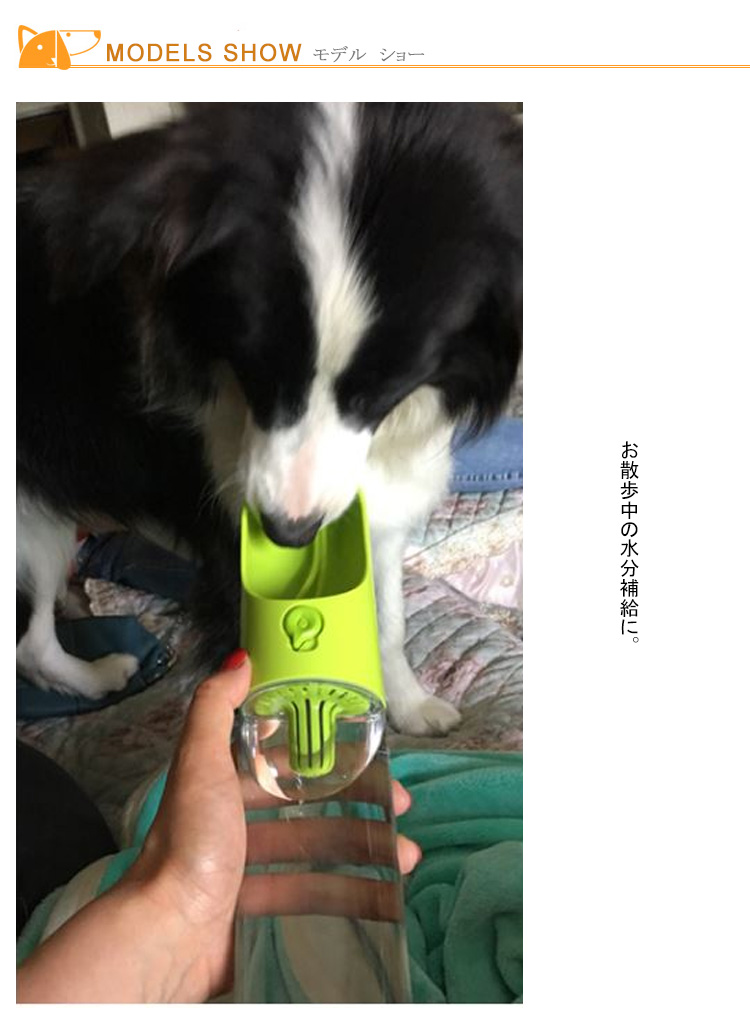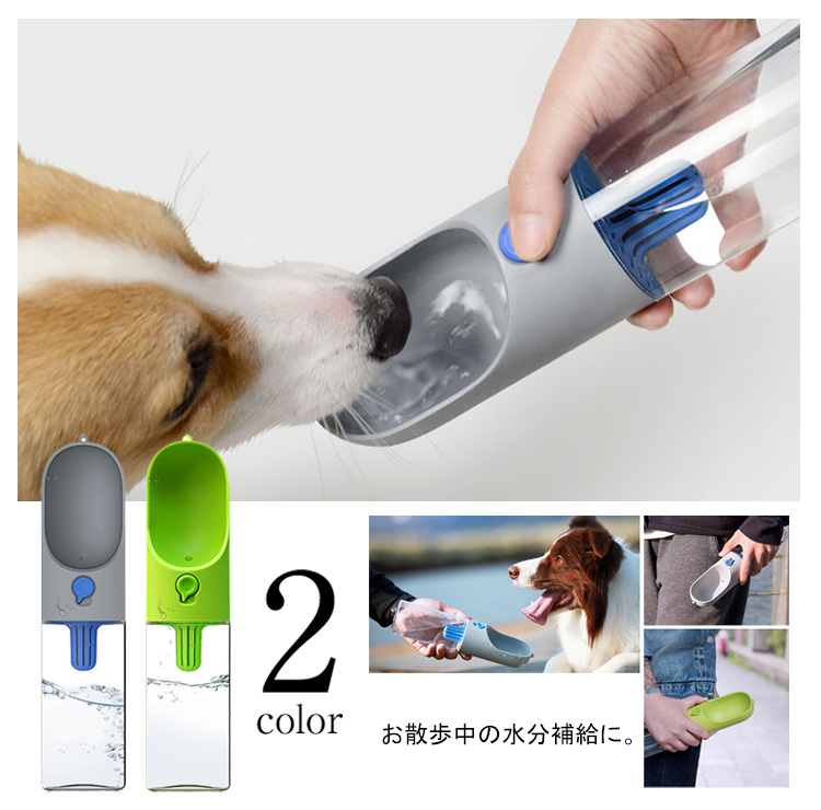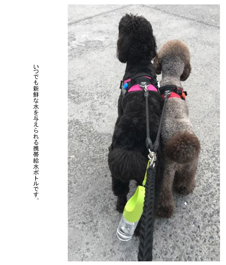 | お散歩中の水分補給に。いつでも新鮮な水を与えられる携帯給水ボトルです。ボタンを軽く押しながら水を少しずつ出します。アウトドアで大活躍する! | |
