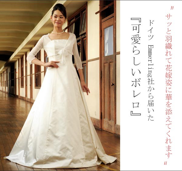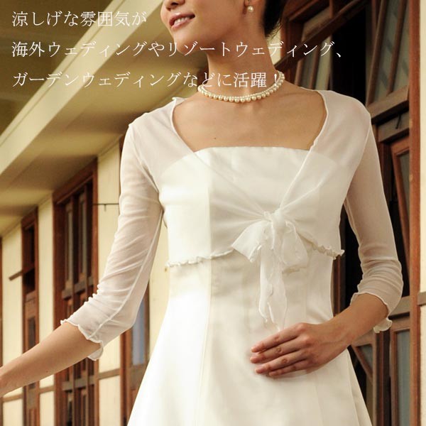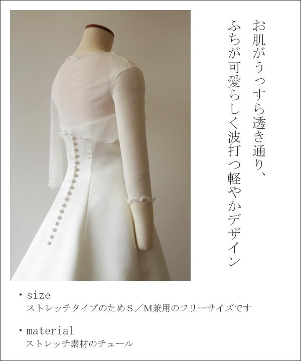 ヴィーヴラマリエ青山店で扱っている、ウエディングドレスとのアレンジにおすすめのボレロ!ストレッチ素材のチュールで作られたボレロです。ドイツ Emmerling社の製品(輸入品)です。お肌がうっすら透き通り、ふちが可愛らしく波打つ軽やかデザイン。涼しげな雰囲気が海外ウェディングやリゾートウェディング、ガーデンウェディングなどに活躍してくれます。Vネックの合わせをリボン結びにしていただくのがおすすめ。ウエディングドレスとコーディネートしやすい、シンプルなデザインです。*こちらはボレロのみの商品となり、ドレスは付属いたしません。 ご注意ください。【検索キーワード】ウェディングドレス/ウエディングドレス/白ドレス/マリッジ/ブライダル/ガーデンウェディング/フォトウエディング/花嫁/新婦/ブライズ/挙式/結婚式/披露宴/パーティ/パーティー/チャペル/教会/人前式/セレモニー/海外/リゾート/ホテル/式場/2次会/1.5次会/前撮り/アクセサリー/ヘアアクセ/ウエディング小物/ウェディング小物/Wedding/Bridal/ギフト/プレゼント/贈り物/花/