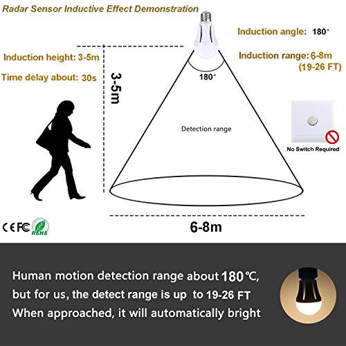 Studio : MS Electronic Co.,Ltd Publisher : MS Electronic Co.,Ltd Product Description The 9W A19 RADAR LED MOTION SENSOR LIGHT BULB will light up automatically while it detects motion within 19-26 FT in the dark,and these motion sensor lights will automatically off after the motion ceased or disappeared about 30s,these LED motion sensor light bulbs give you peace mind and protect you from stumbling in the dark,have 30000h long lifespan,Luxon LED motion sensor lights could be widely used in hallway,elders bedroom,kitchen,garage,backyard,doorway bathroom,porch,shopping center,exhibition hall,hospital,back patio,basement,Corridor,etc. If you install these motion sensor lights outside,when someone comes close to your house the motion sensor bulb will detect that and the light Auto turns on.You needn't worry about if anyone gets on your house to look into your window or check your door knob.Luxon LED motion sensor lights will scare someone off late at night who shouldn't be there..
