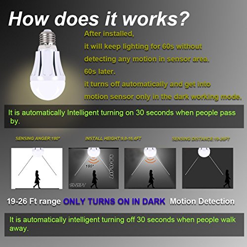 TIPS: ?Make sure the sensor is facing the desired motion area within proper distance and angle; ?When the led sensor bulb keep lighting up make sure there is no any object in the sensor area to move; ?Every time re-install,The motion sensor bulb will keep lighting up for 40-60s; ?Do not install the motion sensor bulb in wet environment and high temperature.Keep it away from heaters,air conditioning, refrigerators,micro waves, stoves; ?The led motion sensor bulb will only turn on while sense a motion in dark at proper distance and angle; ?Make sure the 2 bulb spacing is more than 5m.