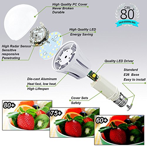 Specification: Power: 9 Watt Material:Aluminum Size: 60x115mm Base type: E26 Beam Angle: 180° Driver:IC constant current driver Lighting sources:LED Epistar COB light Sensor distance:19 -26 feet Delay time:30S Color temperature:2700K Voltage:85-260V/AC Work temperature:-10 to 40 Working humidity:10-70% RH Lifespan:30000h 0