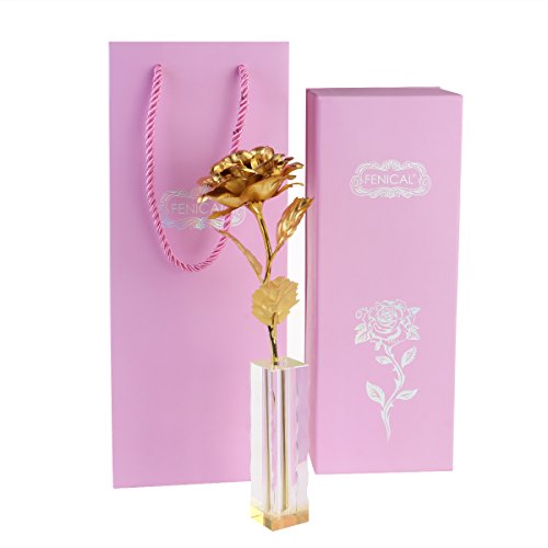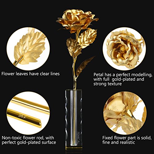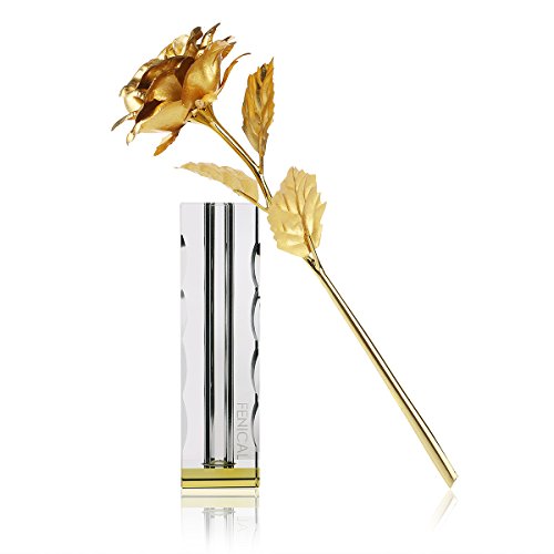 FENICAL 24K Gold Foil Rose Flower with Crystal-Clear Vase Great for New Year, Birthday, Valentine's Day, Anniversary Decoration
