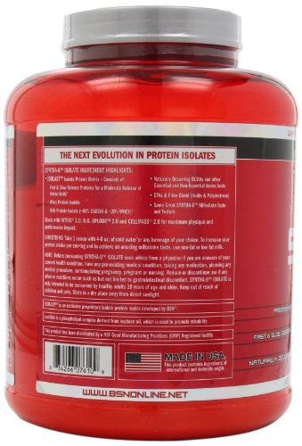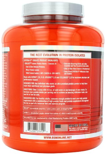 SYNTHA-6 Isolate Ingredient Highlights:ISOLAST Isolate Protein Matrix - Consists of:Fast & Slow Release Proteins for a Moderate Release of Amino AcidsWhey Protein IsolateMilk Protein isolate (80% Casein & 20% Whey)Naturally Occurring BCAAs and other Essential and Non-Essential Amino AcidsEFAs & fiber Blend (Inulin & Polydextrose)Same Great SYNTHA-6 Milkshake Taste and TextureStack with NITRIX 2.0, N.O.-XPLODE 2.0 and CELLMASS 2.0 for maximum physique and performance impact.Feature