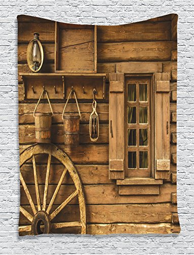 Ambesonne Western Decor Collection, Ancient Wagon Wheel Rustic Wooden Vintage Lantern Window and Buckets Picture, Bedroom Living Kids Girls Boys Room Dorm Accessories Wall Hanging Tapestry, Khaki