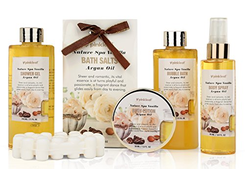 6 PC SPA GIFT SET FOR HER: Our bestselling vanilla spa gift set includes a bottle of shower gel, bubble bath, body spray & body lotion + a pouch of bath salts & a massaging soap bar that boosts circulation.