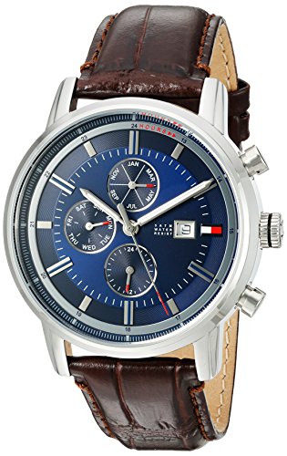 Stainless steel case with a brown leather strap. Fixed stainless steel bezel. Blue dial with silver-tone hands and index hour markers. 24 hour markers. minute markers around the outer rim. Dial Type: Analog. Luminescent hands and markers. Date display at the 3 o'clock position. Three multi-function sub-dials displaying: 24 hour, month and day of the week. Quartz movement. Scratch resistant mineral crystal. Solid case back. Case size: 44 mm. Case thickness: 12.3 mm. Round case shape. Band width: 22 mm. Tang clasp. Water resistant at 50 meters / 165 feet. Additional Info: in general, suitable for short periods of recreational swimming, but not diving or snorkeling. Casual watch style. Tommy Hilfiger Multi-Function Blue Dial Mens Watch 1791244.