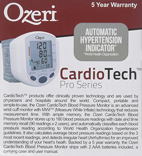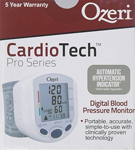 -. Binding : Health and Beauty -. Brand : Ozeri -. Color : White/Gray -. EAN : 0798256450822 -. Feature : Portable, accurate, and simple-to-use with clinically proven technology. / Fully automatic inflation and dynamic measurement technology that varies the inflation process according to real-time blood pressure detection to reduce measurement time and increase user comfort. / Stores 180 blood pressure readings (90 x 2 users) with date and time recordings. / Automatic Irregular heartbeat (Arrhythmia) detection and WHO Hypertension Indicator. / Push-button access to Average blood pressure calculation. -. IsAdultProduct : 0 -. Label : Ozeri -. Manufacturer : Ozeri -. Model : BP01K -. MPN : BP01K -. PackageQuantity : 1 -. PartNumber : BP01K -. ProductGroup : Health and Beauty -. ProductTypeName : HEALTH_PERSONAL_CARE -. Publisher : Ozeri -. Studio : Ozeri -. Title : Ozeri BP01K CardioTech Pro Series Digital Blood Pressure Monitor with Heart Health and Hypertension Indicator -. UPC : 815817010216