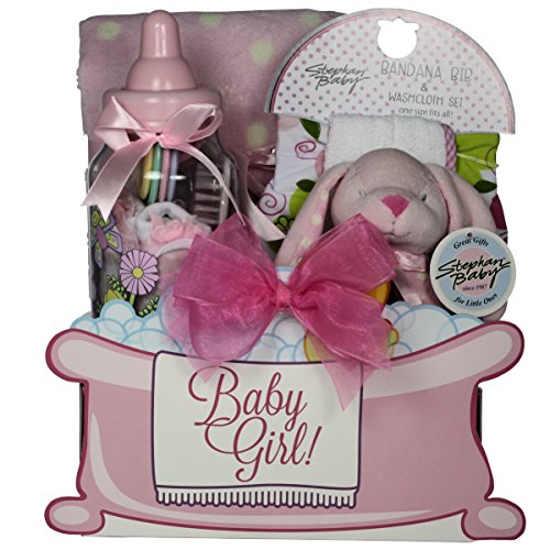 -. Feature : Let them know how excited you are about their new baby girl by sending them this "Baby Essentials" Baby Girl Gift Basket. / It includes a Super Soft Polka Dot Blanket & Bunnie Rattle Set, "Flutterby" Garden Themed Bottle Bank Gift Set. / A Bandana Bib and Washcloth Gift Set in a Swirly Flower Design. / All of this in a Precious Baby Girl Bubbles Gift Box. / Dim: 14"L x 12"W x 8"H