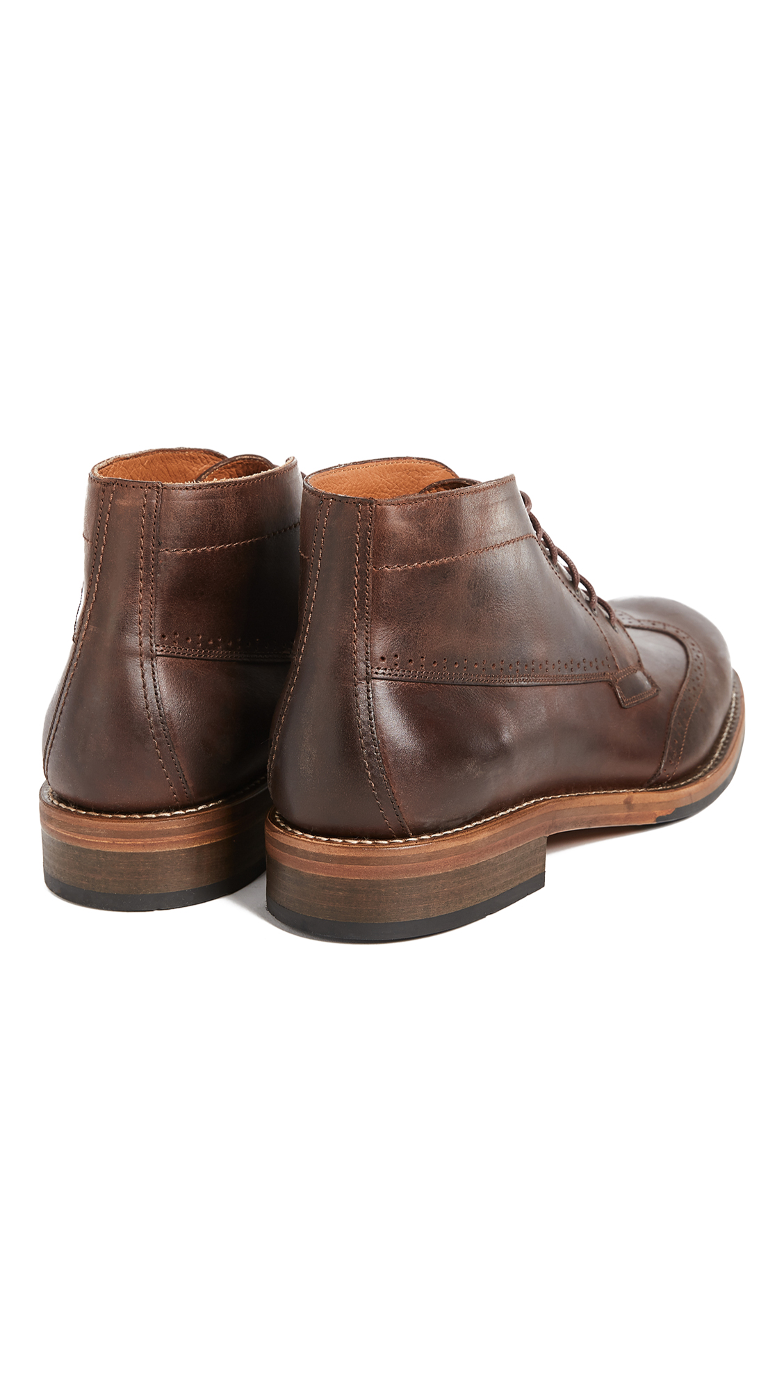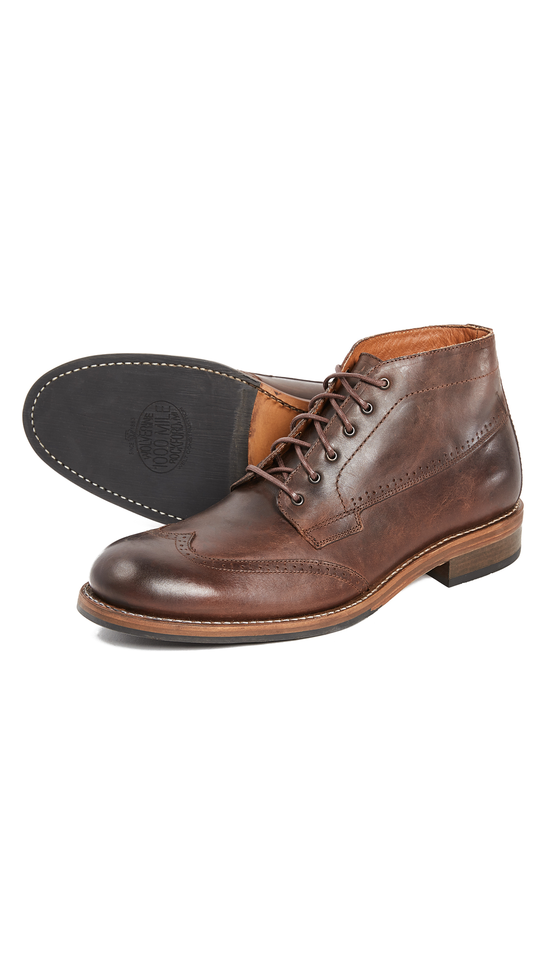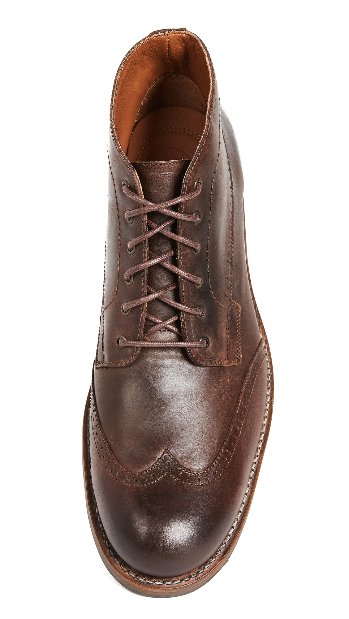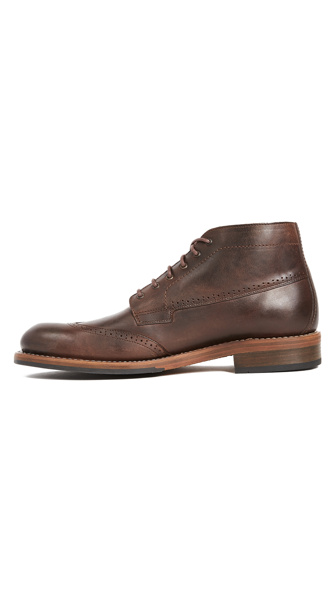 Refined Wolverine 1000 Mile boots in burnished leather. Brogue details at the wing-tip toe and side seams. Welted to a rubber-tipped leather sole. Stacked heel. Full leather sock liner.