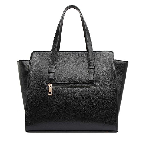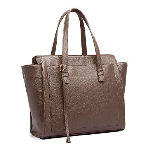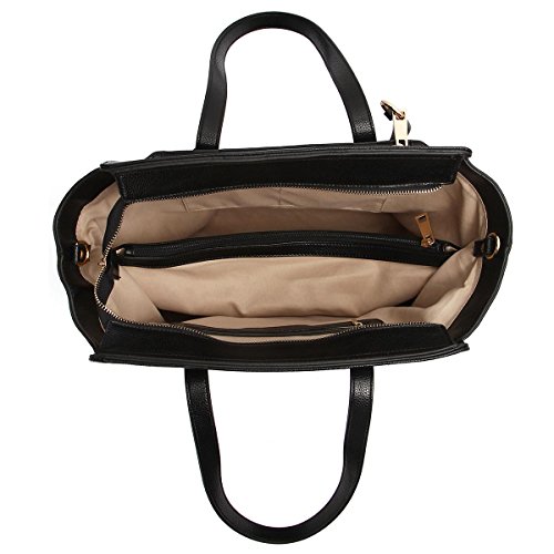 Interior: 2 open compartment,1 center zipped compartment, 2 side cell phone pouches and 1 side zippered pocket