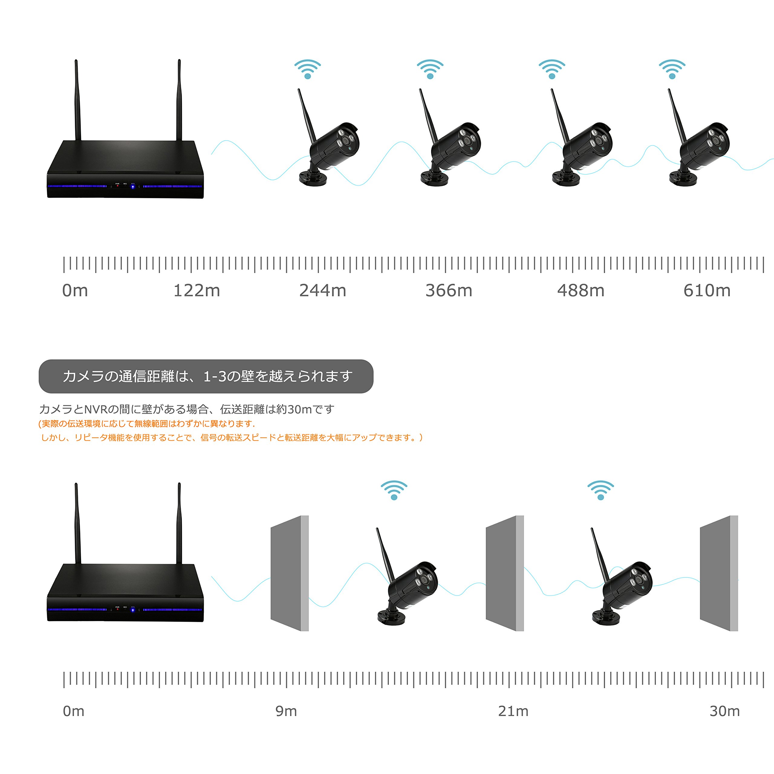 By using the repeater function, when there is a wall distance between the camera and the NVR up to 600 M of the radio wave reaching range under the outlook environment, you can cross the walls of 1 to 3 and use it as a guide of 30 m!
