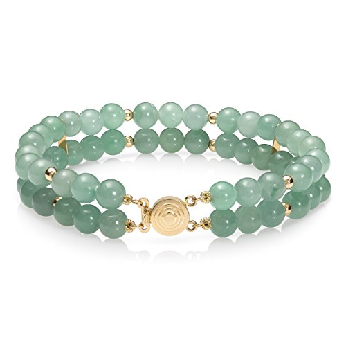 Brighten up your look with this simple, yet stunning, strand style two-row bracelet featuring 6.0mm round jade gemstones with 3.0mm solid 14k yellow gold accent beads. Separated by gold dividers, this glowing bracelet is secured with a 14k yellow gold two-row round push clasp; offering security, ease of use, comfort, and style. Polished to a bright shine, and treated to enhance the beauty and vibrant color, this 7.5" jade bracelet is simply a jewelry box must have.Feature