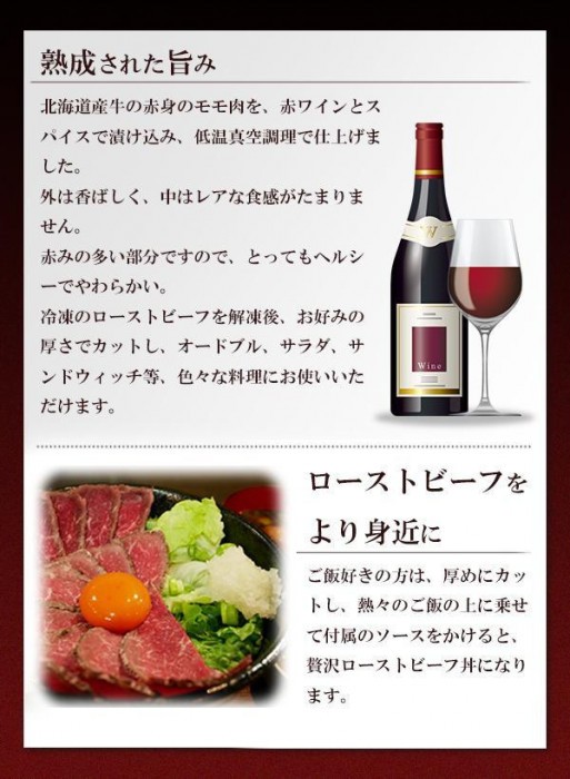 | 北海道産牛の赤身のモモ肉を、赤ワインとスパイスで漬け込み、低温真空調理で仕上げました。お好みの厚さにカット出来るので色々な料理にお使いいただけます。冷凍状態でのお届けなので、長期保存可能。玉ねぎソース、レホール(西洋わさび)付き。 |
