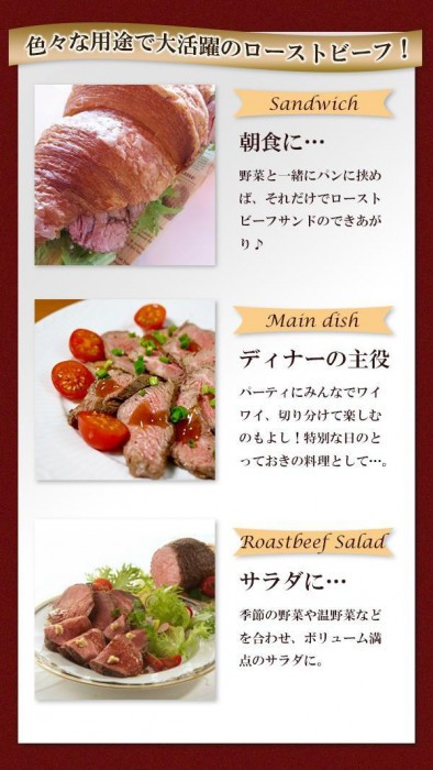 | セット内容 | ・北海道産牛ローストビーフ 200g×2パック ・玉ねぎソース 20g×2パック ・レホール 3g×2パック ・説明書×1 |