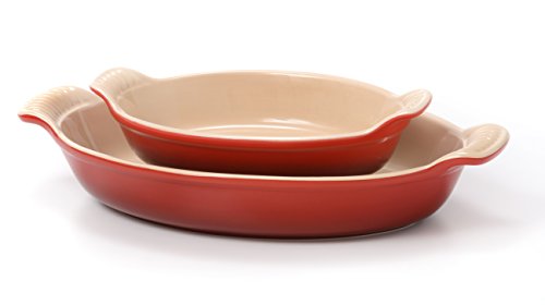 Studio : Le Creuset Publisher : Le Creuset Product Description Treat yourself to something delicious with this two piece set of Le Creuset au gratin dishes. These incredibly versatile cast stoneware pieces are perfect for all of your needs, from baking to serving and even storing. Each cookware piece is fired at 2156 degrees Fahrenheit, making them virtually nonporous so they don't absorb flavors, odors, or moisture. The enameled surface also makes them incredibly resistant to scratches, chipping, and staining. The Heritage style flared handles allow for safe maneuvering directly from oven to table. Perfect for individual servings, these unique little dishes offer huge possibilities. Serve up some snacks, appetizers, or your very own creme brulee, and enjoy the easy clean-up when you're through. Suitable for use in the oven up to 500 degrees Fahrenheit, these dishes can be broiled or baked. Backed by a five year manufacturer's warranty, they are also dishwasher safe for easy cleanup. 1.7 quart au gratin -- 8" L x 14" W x 2-1/2" H; 24 ounce au gratin -- 8" L x 5-3/4" W x 1-1/4" H 0