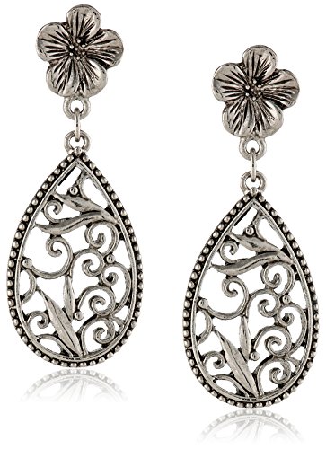 Vintage inspired silver-tone filigree teardrop earrings with feminine flower accents