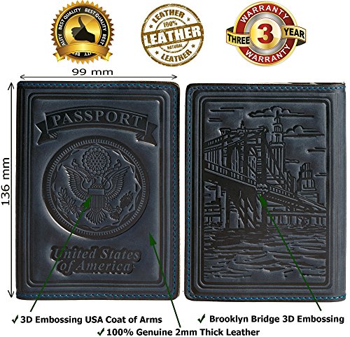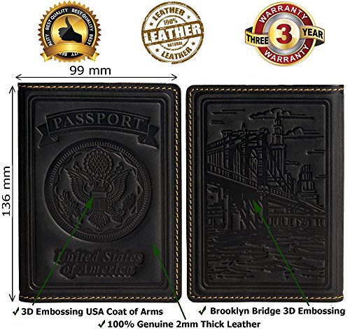 -. Feature : DURABLE & USABILITY Many years of experience with making Incredible Leather goods and improved by Customers Reviews records of high quality our products, allowed us to manufacture leather goods and run our business successfully. Although, taking into account your advice we had developed and improved a new technology for easy bending of genuine leather in passport cover. Now our Villini Passport Cover Holder is durable and proper protection for the document from dust and any unexpected damage. / 3 YEAR WARRANTY - We are sure of the amazing quality of our pretty product. Although, that our Passport Case made of Impeccable Genuine Leather 1,7mm thick and have 3 Years minimum of the service a life. Many of sales experience have shown that the Passport Cover Holder is exquisite and reliable quality product. We have extended the period of warranty after the consultation of customers in Europe, many of them enjoying the product more than 10 Years and still have not lost its form. / EXCLUSIVE 3D EMBOSSING - Passport Holder Cover was created by the group of European designers, which are had a task to develop a stylish passport with the USA national symbols and famous seen sights. The creative team had made the decision and presented on the front side of the Passport Holder Case the USA Coat Of Arms and Americans Famous The Brooklyn Bridge, which will always, reminds you in any journey about your country wherever you are / MONEY BACK GUARANTEE AND YOUR INVESTMENT PROTECTION - If for some reason you do not like our product, we will refund your money back or we will provide you with choice of other of our products as soon as possible. You will be ensured that your notes and objective criticism has been taken very seriously. / AFFORDABLE P.R.ICE - HIGH QUALITY - PRESENTABLE PACKAGE- Manufacture and Development of high standards, and quality sturdy products has to be in good hands that why we recruiting to work the Leather Craftsman with many years of experience and dip knowledge in leather works. For the manufacture of the Passport Covers Holders , we are using high quality expensive materials and branded packaging. At the same time we have kept for you an optimal cost of a Luxury product.