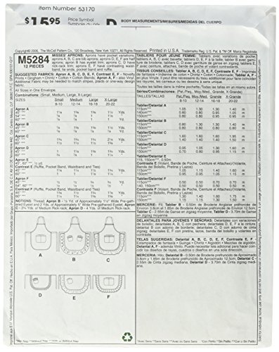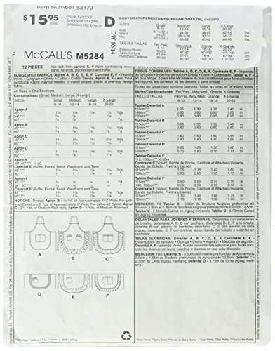 -. Binding : Kitchen -. Brand : McCall's Patterns -. Color : N/A -. EAN : 0023795531702 -. Feature : All Sizes in One Envelope / Includes pattern pieces and sewing instructions / Made by McCall's Patterns / Copyright 2011 / P.R.Inted in the USA -. Label : McCall Pattern Company -. Manufacturer : McCall Pattern Company -. Model : M5284OSZ -. MPN : M5284OSZ -. NumberOfItems : 1 -. PackageQuantity : 1 -. PartNumber : M5284OSZ -. ProductGroup : Art and Craft Supply -. ProductTypeName : HOME -. Publisher : McCall Pattern Company -. Size : All Sizes in One Envelope -. Studio : McCall Pattern Company -. Title : McCall's Patterns M5284 Aprons, All Sizes -. UPC : 023795531702