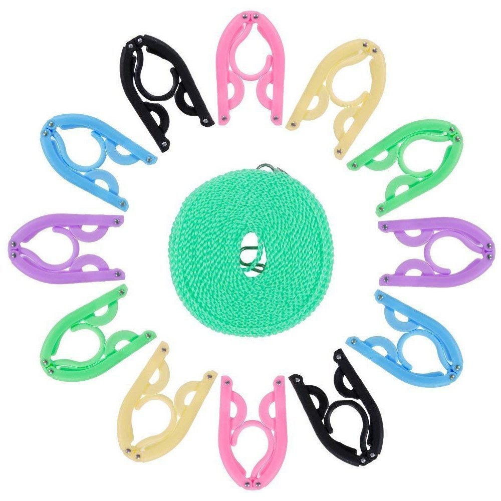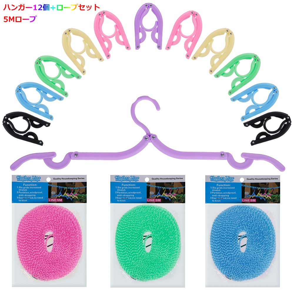 【梱包 】折り畳み式ハンガー 12個(黄色・緑色・青色・紫色・ピック.ブラックそれぞれ2個)、5mのハンガーストップロープ1本(青・緑・ピンク三色の中で一つ、色ランダム)