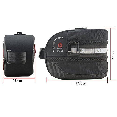 -. Feature : Dimensions: Approx. 175mm*100mm*110mm. LED warning Multicolor light emitting bicycle tail packet / Rainproof with a bag mount casing design which you can use as a storage for any small belongings like bicycle repair tool, smart phones. Fast and easy installation. / Made from Safety and high shake resistance material. Expandable for added capacity / A convenient gear-toting solution that clips instantly to the back of your bike's saddle and seat post, suitable for all types of saddles/seats. / Best suitable for Cycling, Biking, Traveling, Emergency signal light replacement and many related option.