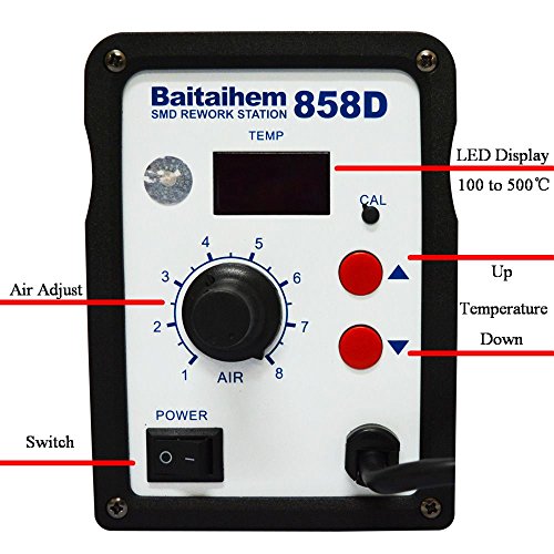 Airflow is strong and mild but with low noise. Temperature is very easy and convenient to adjust. The hot gun has PIR sensor. Once it's hold, 858D will go to work soon. And once hand off, it will go back to rest mode. Ideal for safe demolition solder QFP, PLCC, SOP, BGA and other chips and components which are temperature-sensitive.