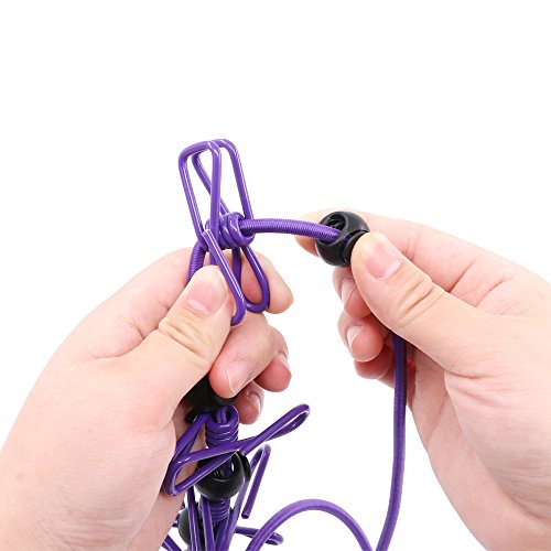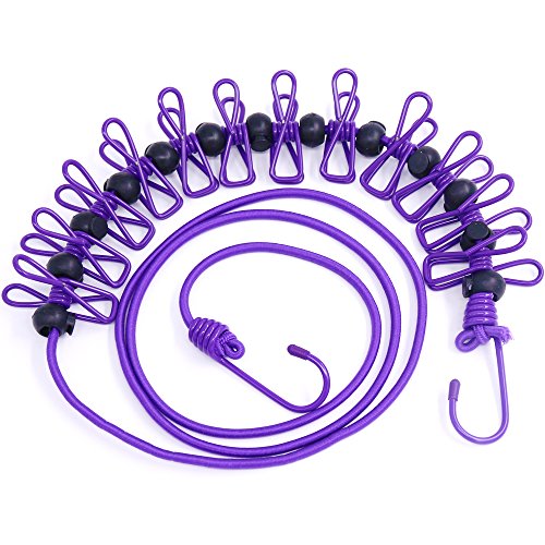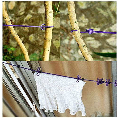 - ✔ SUPER-ELASTIC & ADJUSTABLE: It's super-elastic and 1.8 meters in non-stretched condition, can be stretched to any length up to 3.8 meters. It is very convenient that the 12 clips can move freely on the rope. Between the clips with a non-slip rubber, so when the wind blows, the clothes will not be attached together, easy to dry clothes.