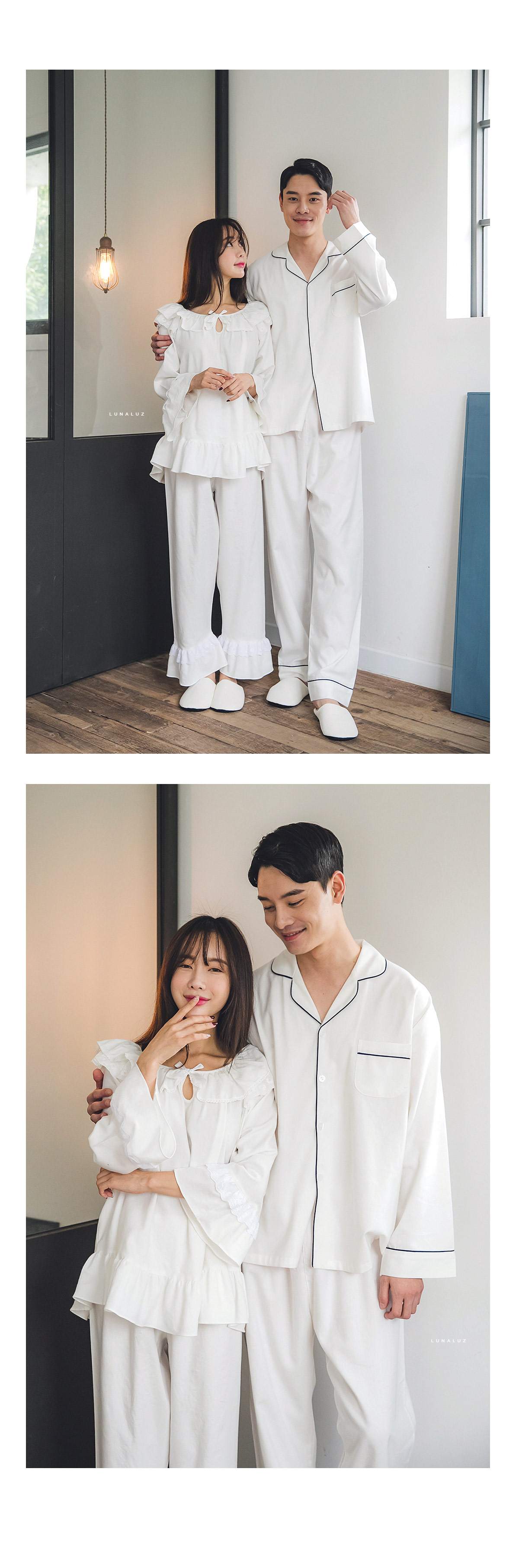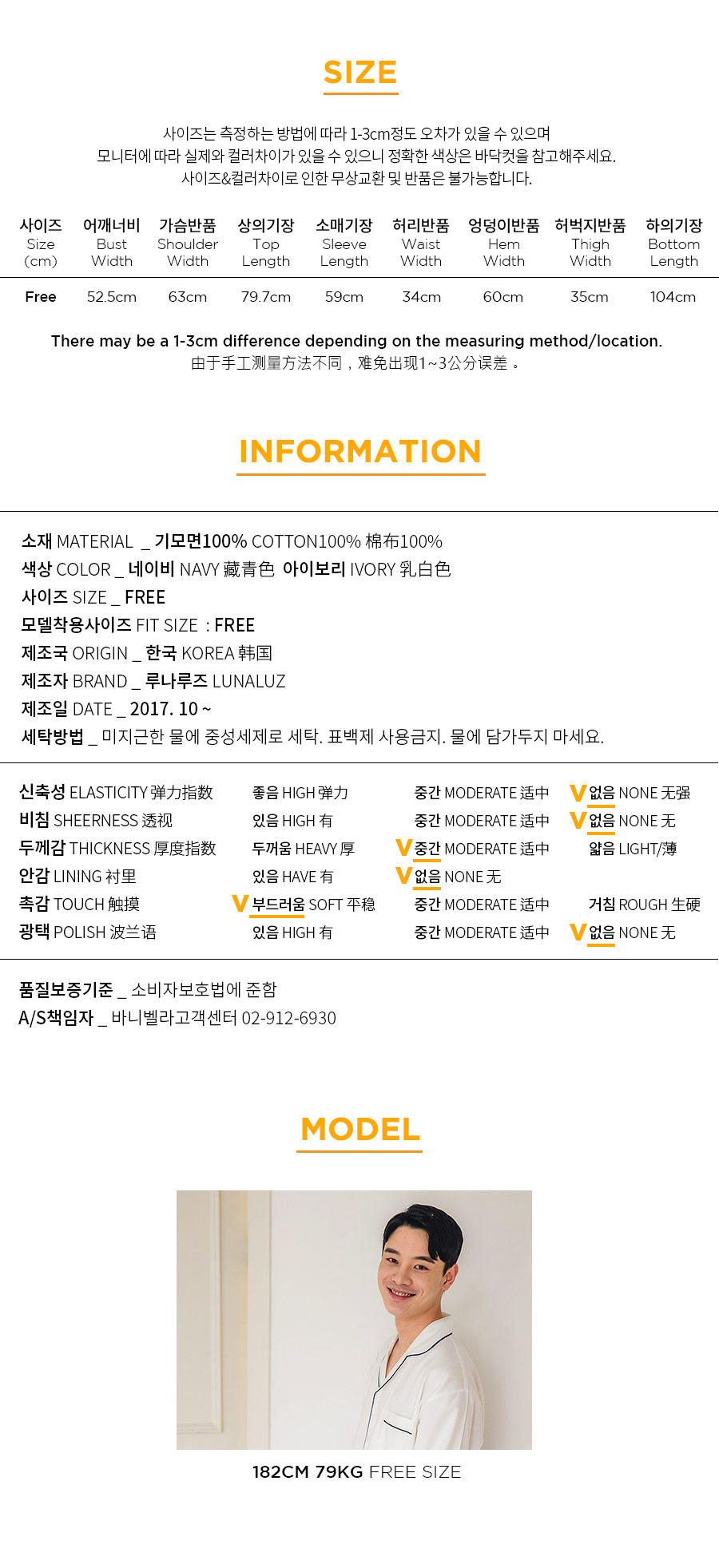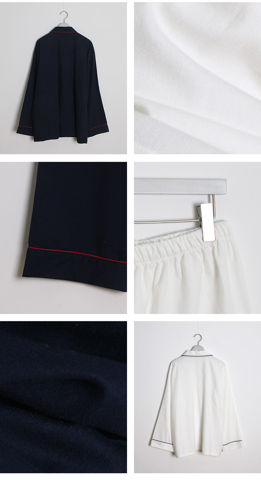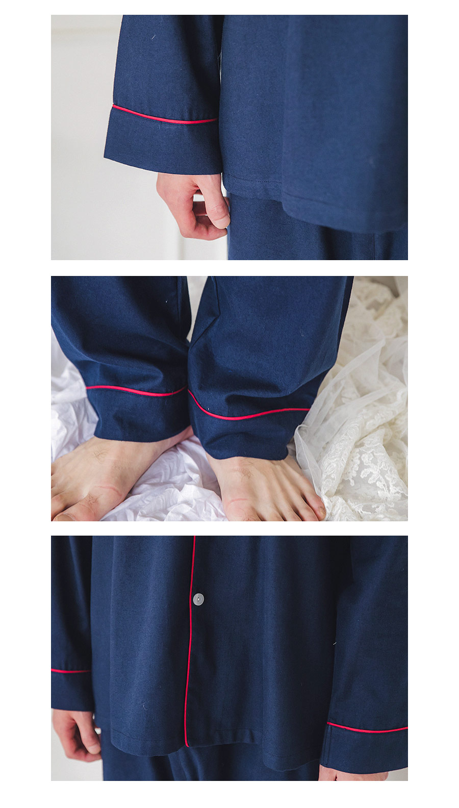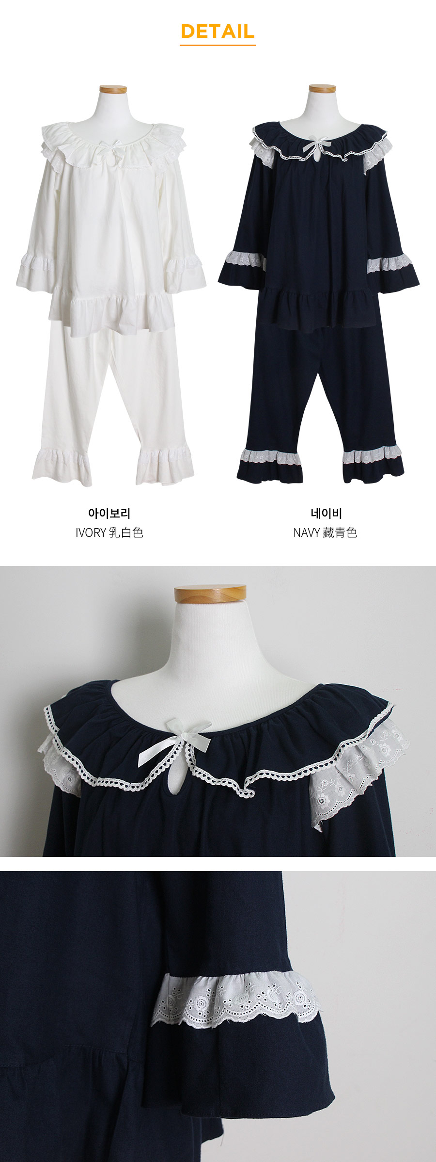 포근한 기모 가공 소재와 깔끔한 컬러의 조화! 포근한 보온성을 가진 기모 소재로 가을~겨울 실내에서 입기 좋습니다. 섬유를 한 번 더 긁어내어 보온성을 높이고, 아늑한 느낌은 더해주었습니다. 컬러를 직접 BT내어 꼼꼼하게 염색한 원단으로 어느 피부톤에도 잘 맞는 깔끔한 컬러에요. 컬러는 아이보리, 네이비 2가지를 냈습니다. 기모 소재의 특성상 필링 현상이 일어날 수 있는 점 참고 부탁드립니다 :> DETAIL여성 잠옷은 목선과 쇄골라인을 가장 여리하고 예쁘게 내어주는 라운드 네크 라인과 어깨를 덮어주는 프릴 장식, 면레이스 장식을 레이어드 봉제해 페미닌한 무드를 한 층 더 업그레이드 시켜주었습니다. 하늘거리는 레이스 장식이 여성스러움을 극대화 시켜주며 래글런 패턴을 응용해 입었을 때, 더욱 여리하고 슬림 해 보이는 효과를 줍니다. 소매 부분과 팬츠의 하단은 벨 라인으로 퍼지듯이 떨어지고, 양 사이드에 리본과 레이스를 달아 다시 한 번 포인트 주었습니다. 원단의 소요량과 다양한 부자재를 사용하여 퀄리티 있게 디자인 했으며, 입었을 때, 편하고 낙낙하지만 부하지 않고 여리 하게 떨어집니다. 남성 잠옷은 깔끔한 포켓 카라 스타일의 디자인으로 질리지 않고 계속 해서 손이 갈 스타일의 심플한 잠옷 스타일 입니다. 네이비 컬러의 잠옷은 카라의 끝 부분과 소매, 발목 부분에 고급스러운 레드 컬러의 파이핑을 봉제해 포인트를 주었습니다. 아이보리 컬러의 잠옷은 네이비 컬러 파이핑으로 포인트를 주었습니다. 스타일리쉬 하면서 고급스럽게 연출하기 좋은 스타일의 잠옷입니다. 신혼 커플 잠옷으로도 적극 추천해드리는 잠옷입니다. 100% 국내 제작으로 소재, 디자인, 봉제의 퀄리티가 높습니다. SIZE여성 사이즈는 평균 44반~66 size에게 적합한 free 사이즈 입니다. 남성 사이즈는 평균 100size에게 적합한 free 사이즈 입니다.