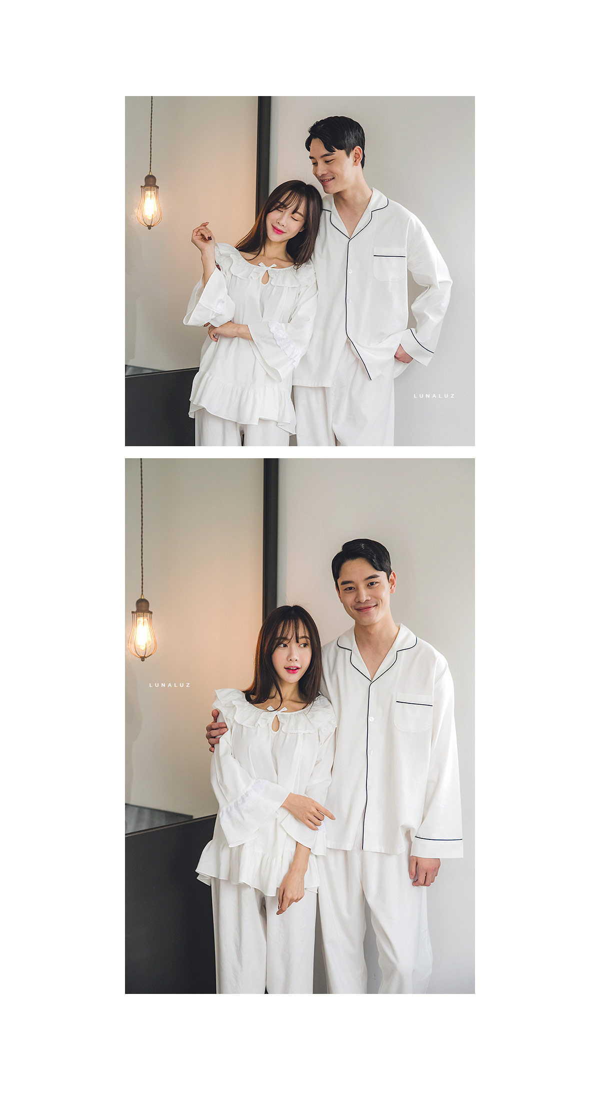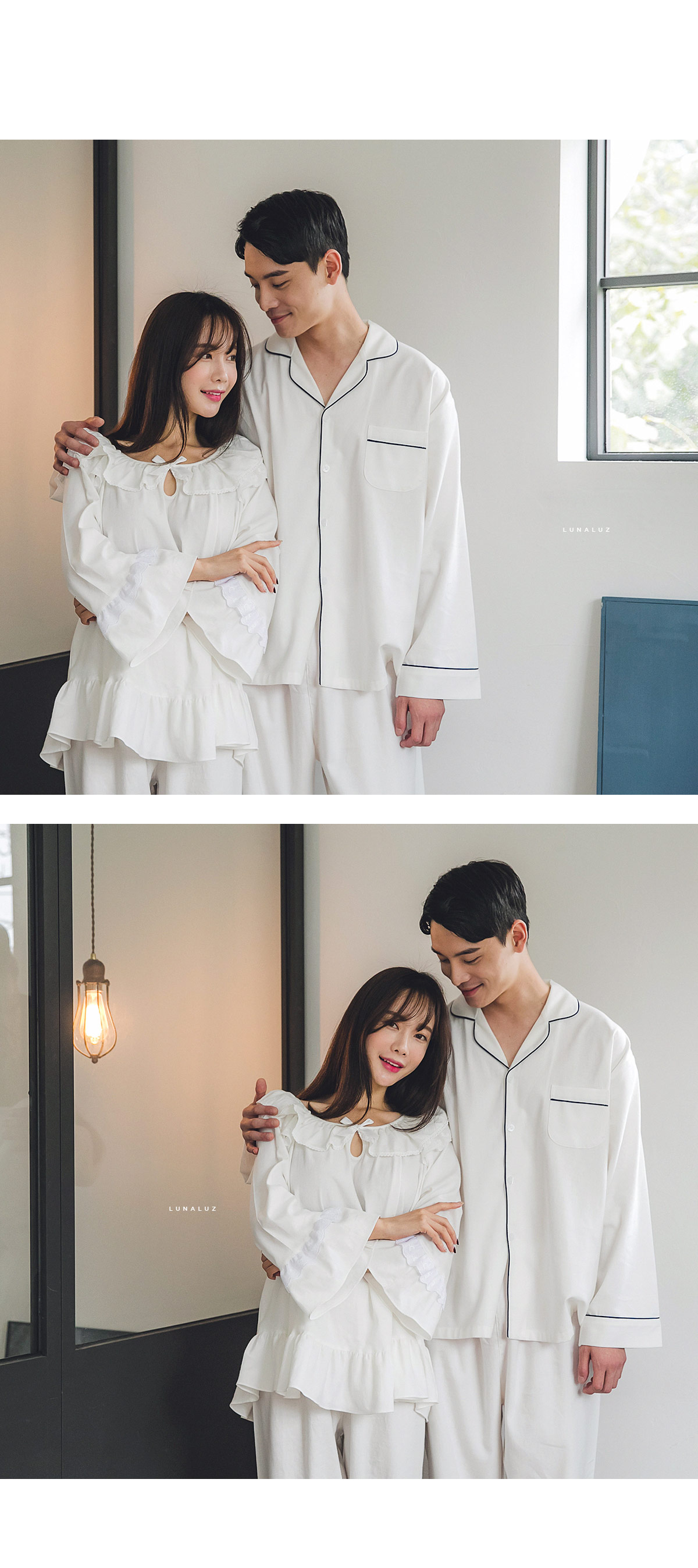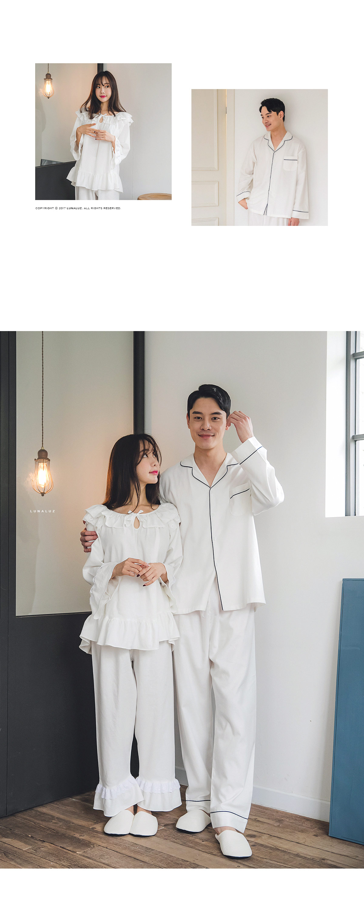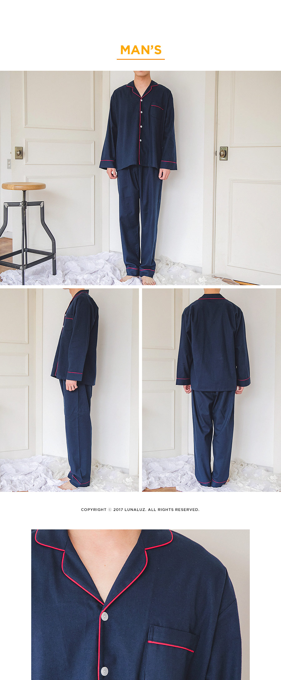 포근한 기모 가공 소재와 깔끔한 컬러의 조화! 포근한 보온성을 가진 기모 소재로 가을~겨울 실내에서 입기 좋습니다. 섬유를 한 번 더 긁어내어 보온성을 높이고, 아늑한 느낌은 더해주었습니다. 컬러를 직접 BT내어 꼼꼼하게 염색한 원단으로 어느 피부톤에도 잘 맞는 깔끔한 컬러에요. 컬러는 아이보리, 네이비 2가지를 냈습니다. 기모 소재의 특성상 필링 현상이 일어날 수 있는 점 참고 부탁드립니다 :> DETAIL여성 잠옷은 목선과 쇄골라인을 가장 여리하고 예쁘게 내어주는 라운드 네크 라인과 어깨를 덮어주는 프릴 장식, 면레이스 장식을 레이어드 봉제해 페미닌한 무드를 한 층 더 업그레이드 시켜주었습니다. 하늘거리는 레이스 장식이 여성스러움을 극대화 시켜주며 래글런 패턴을 응용해 입었을 때, 더욱 여리하고 슬림 해 보이는 효과를 줍니다. 소매 부분과 팬츠의 하단은 벨 라인으로 퍼지듯이 떨어지고, 양 사이드에 리본과 레이스를 달아 다시 한 번 포인트 주었습니다. 원단의 소요량과 다양한 부자재를 사용하여 퀄리티 있게 디자인 했으며, 입었을 때, 편하고 낙낙하지만 부하지 않고 여리 하게 떨어집니다. 남성 잠옷은 깔끔한 포켓 카라 스타일의 디자인으로 질리지 않고 계속 해서 손이 갈 스타일의 심플한 잠옷 스타일 입니다. 네이비 컬러의 잠옷은 카라의 끝 부분과 소매, 발목 부분에 고급스러운 레드 컬러의 파이핑을 봉제해 포인트를 주었습니다. 아이보리 컬러의 잠옷은 네이비 컬러 파이핑으로 포인트를 주었습니다. 스타일리쉬 하면서 고급스럽게 연출하기 좋은 스타일의 잠옷입니다. 신혼 커플 잠옷으로도 적극 추천해드리는 잠옷입니다. 100% 국내 제작으로 소재, 디자인, 봉제의 퀄리티가 높습니다. SIZE여성 사이즈는 평균 44반~66 size에게 적합한 free 사이즈 입니다. 남성 사이즈는 평균 100size에게 적합한 free 사이즈 입니다.