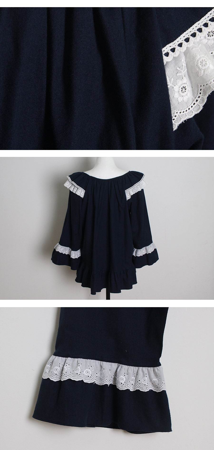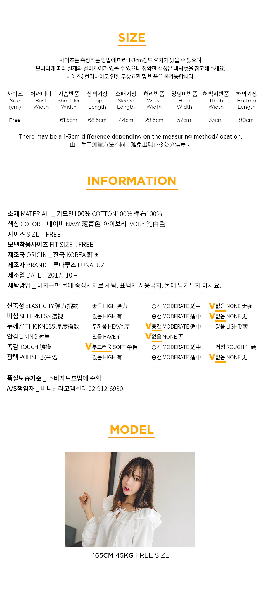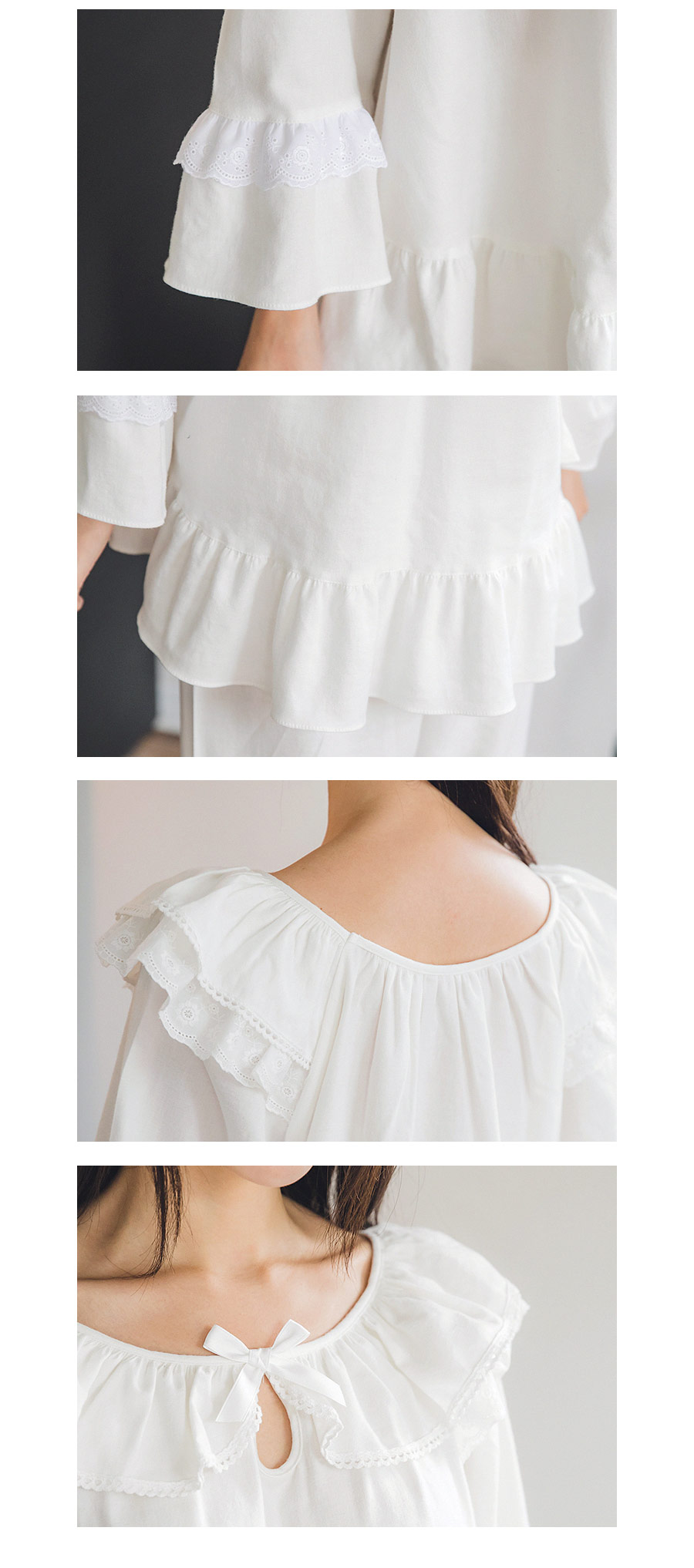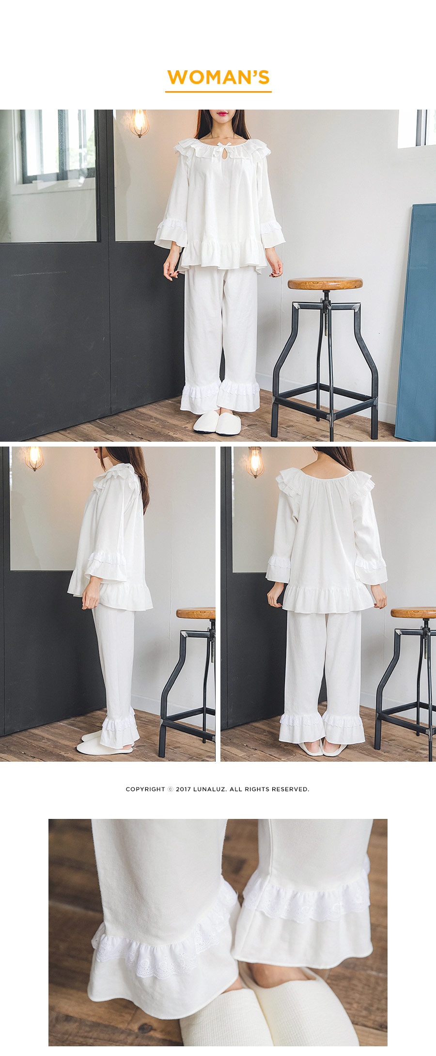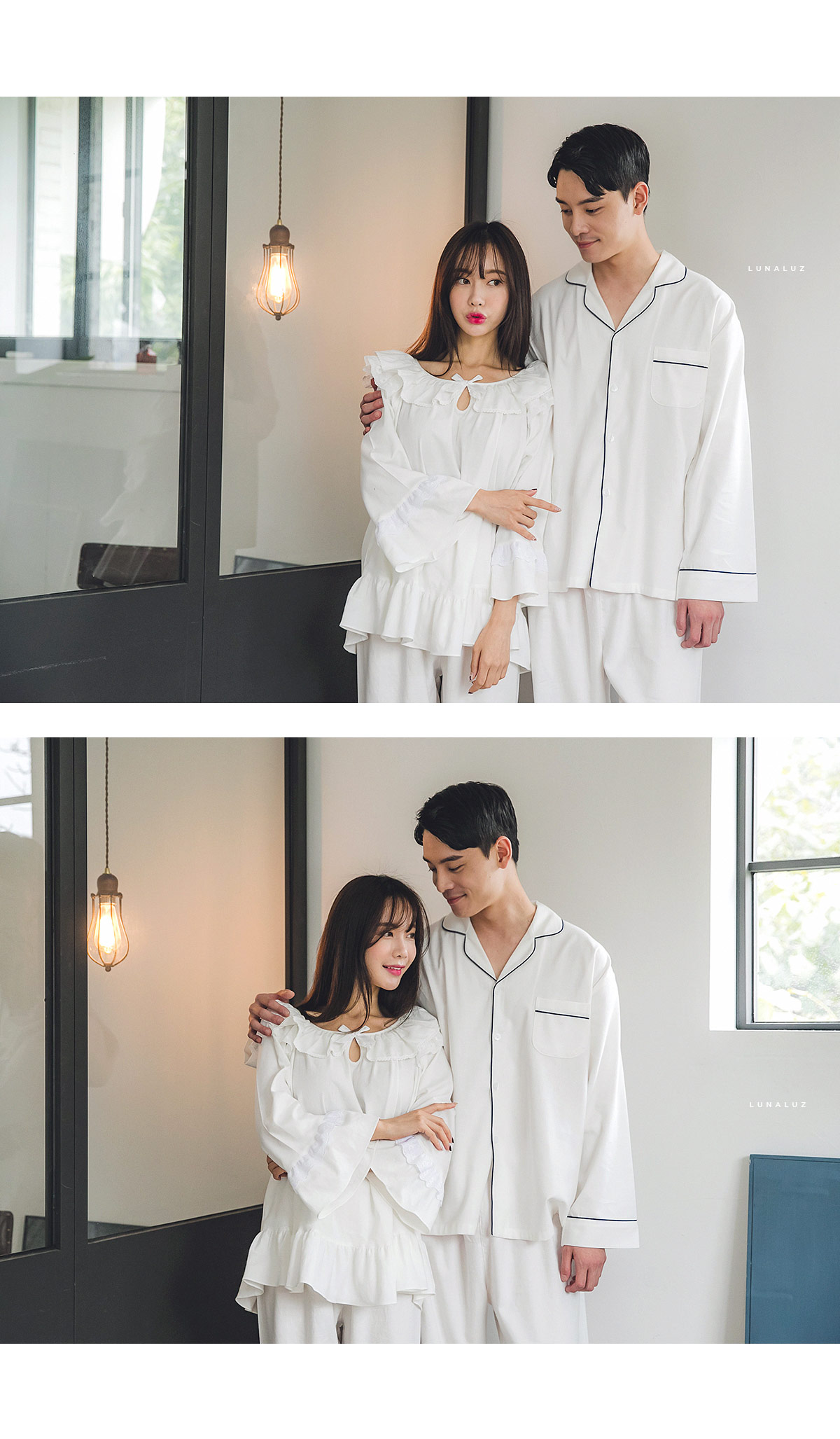 포근한 기모 가공 소재와 깔끔한 컬러의 조화! 포근한 보온성을 가진 기모 소재로 가을~겨울 실내에서 입기 좋습니다. 섬유를 한 번 더 긁어내어 보온성을 높이고, 아늑한 느낌은 더해주었습니다. 컬러를 직접 BT내어 꼼꼼하게 염색한 원단으로 어느 피부톤에도 잘 맞는 깔끔한 컬러에요. 컬러는 아이보리, 네이비 2가지를 냈습니다. 기모 소재의 특성상 필링 현상이 일어날 수 있는 점 참고 부탁드립니다 :> DETAIL여성 잠옷은 목선과 쇄골라인을 가장 여리하고 예쁘게 내어주는 라운드 네크 라인과 어깨를 덮어주는 프릴 장식, 면레이스 장식을 레이어드 봉제해 페미닌한 무드를 한 층 더 업그레이드 시켜주었습니다. 하늘거리는 레이스 장식이 여성스러움을 극대화 시켜주며 래글런 패턴을 응용해 입었을 때, 더욱 여리하고 슬림 해 보이는 효과를 줍니다. 소매 부분과 팬츠의 하단은 벨 라인으로 퍼지듯이 떨어지고, 양 사이드에 리본과 레이스를 달아 다시 한 번 포인트 주었습니다. 원단의 소요량과 다양한 부자재를 사용하여 퀄리티 있게 디자인 했으며, 입었을 때, 편하고 낙낙하지만 부하지 않고 여리 하게 떨어집니다. 남성 잠옷은 깔끔한 포켓 카라 스타일의 디자인으로 질리지 않고 계속 해서 손이 갈 스타일의 심플한 잠옷 스타일 입니다. 네이비 컬러의 잠옷은 카라의 끝 부분과 소매, 발목 부분에 고급스러운 레드 컬러의 파이핑을 봉제해 포인트를 주었습니다. 아이보리 컬러의 잠옷은 네이비 컬러 파이핑으로 포인트를 주었습니다. 스타일리쉬 하면서 고급스럽게 연출하기 좋은 스타일의 잠옷입니다. 신혼 커플 잠옷으로도 적극 추천해드리는 잠옷입니다. 100% 국내 제작으로 소재, 디자인, 봉제의 퀄리티가 높습니다. SIZE여성 사이즈는 평균 44반~66 size에게 적합한 free 사이즈 입니다. 남성 사이즈는 평균 100size에게 적합한 free 사이즈 입니다.