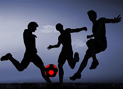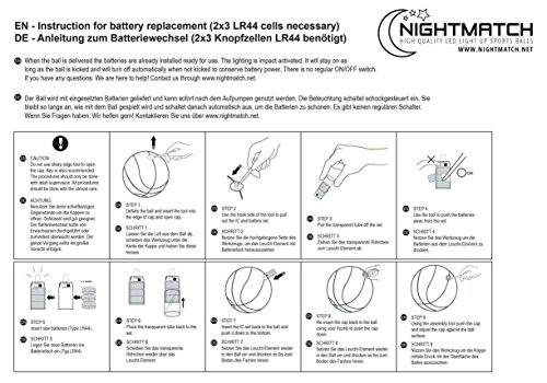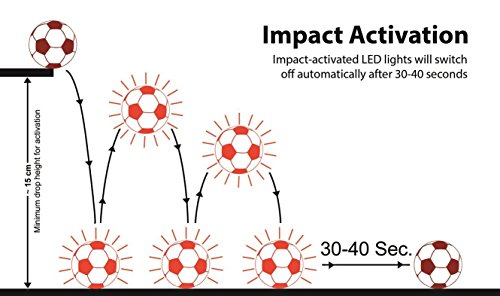 -. Feature : IMPACT ACTIVATED LEDs - Two high quality LED lights located inside the football make this ball light up and glow when bounced or kicked! It will only stay lit up when actively played and will automatically switch off after 30 seconds without action. There is no mechanical switch on the ball. This ball is much brighter than other "glow in the dark balls" you may find. They actively glow using battery powered LEDs - they are NOT just passively using fluorescence. / BALL PUMP, BATTERIES AND EXTRA-SET OF SPARE BATTERIES INCLUDED - The ball is delivered deflated like most other balls. A proper standard ball pump is included to easily inflate the ball and you can use it for other balls as well! The ball comes with mounted batteries and is ready to play. An extra set of spare batteries is included additionally. The batteries will last about 30 hours of playing and are easy to replace. A tool and a manual are included to make battery changing even easier. / HIGH QUALITY - This ball is not one of these cheap toys that will only last a couple of days. It plays just like a normal soccer ball. It is made from high-quality materials, is very sturdy, durable and even waterproof! / OFFICIAL SIZE & WEIGHT - This ball matches the official SIZE 5 and weight. It measures: Circumference = ~69 cm / 27 inch, diameter = ~ 22 cm / 9 inch, weight = ~ 430 g / 15 oz. Size 5 is the most commonly used size in soccer matches worldwide. / GREAT FUN - enjoy playing soccer in twilight and dark. You, your kids, friends and even your soccer club team members will love it! The ball is very bright in the dark and can be seen from far distances!