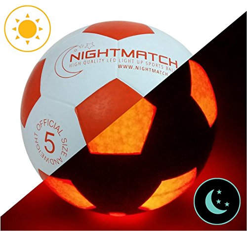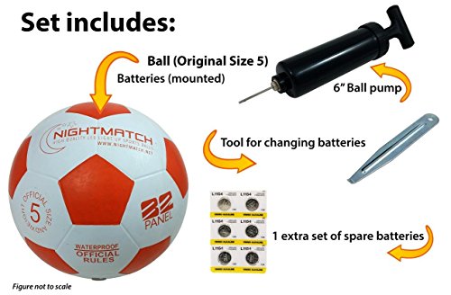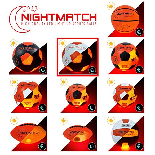 -. Title : NightMatch Light Up Soccer Ball INCL. BALL PUMP and SPARE BATTERIES - White Edition - Inside LED lights up when kicked - Glow in the Dark Soccer Ball - Size 5 - Official Size & Weight - white/orange
