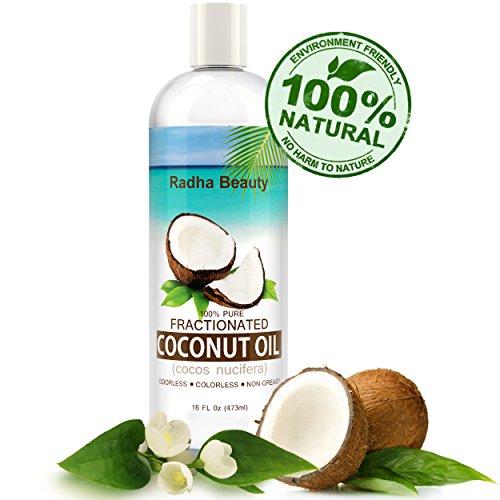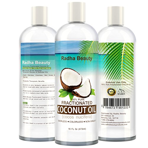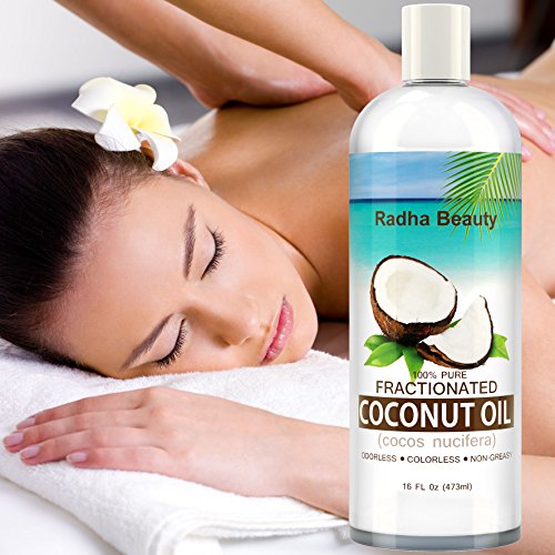 - Feature : PREMIUM FRACTIONATED COCONUT OIL - Our oil is 100% Pure Fractionated Coconut Oil - No Fillers. The Highest Quality carrier oil available on the market. Whether rubbed on the skin or hair it penetrates deeply, nourishes, moisturizes, and softens. 16 OUNCE BOTTLE / BEST CARRIER OIL for Massage, Therapeutic Recipes & Essential Oils. It also has natural antioxidant and disinfecting properties and does not clog pores. It is an extremely versatile oil that can be used for making anything from bug repellent to hair serum. / BENEFITS - Radha Beauty Fractionated coconut oil has many benefits over traditional coconut oil since it is highly purified. It primarily contains the fatty acids capric and caprylic acid. Since the majority of the impurities are removed, it is much more stable and has a longer shelf life. In addition, the oil is a very good for use in health products. / WORKS OR YOUR MONEY BACK - Our Guarantee: We back our products up with a LIFETIME hassle-free money back guarantee, no matter where you buy our product. There is absolutely no risk to you when you order now! If you are not completely satisfied, simply contact us and we will give you a full refund, no questions asked (you do not even have to return the bottle). Our #1 priority is to make sure our customers are completely happy. / ODORLESS, NON-GREASY & COLORLESS - This wonderful fractionated Oil is always Liquid, Odorless, Colorless, Non Greasy & Non Staining. In addition, Fractionated coconut oil is widely used in health products, lotions, hair care products and soaps. It is easily absorbed by the skin and doesn't leave a greasy feeling. Since it is thinner than unrefined coconut oil, it is an excellent oil for use in massage. It is also very useful as a carrier oil in aromatherapy products. You can wipe your eye and face makeup off instantly with no residue left behind. In addition, it is odorless and tasteless and can withstand very high heat so it can be used in cooking.