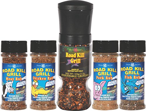 -. Feature : Dean Jacob's Road Kill Grill Collection / This 5 pc. Collection includes: 4 Shaker Jars ► 3.4 oz. Meat Rub ► 2.9 oz. Chicken Rub ► 3.0 oz. Pork Rub ► 3.4 oz. Fish Rub ~ Plus ► 4.0 oz. Adjustable Gripper Grinder Mill / Dean Jacob's Road Kill Rubs aren't just for back road mishaps! Great flavor whether you're cooking indoors or outdoors. / Kosher • Made in a peanut/tree nut free facility. / Ingredients shown below