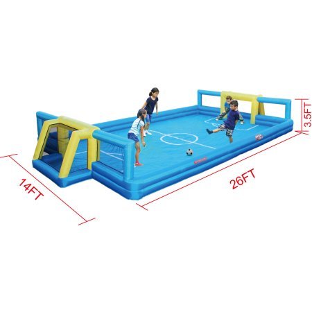 Studio : Generic Publisher : Generic Binding : Toy Product Description Turn any backyard into a playing field with the Sportspower Inflatable Soccer Field. Constructed of 200D Polyester and 190T polyester with a PU coating, it is durable enough to withstand repeated play. With two soccer goals, kids can play a full soccer field game! A blower inflates it quickly to provide a soccer goal on each end of the field. A soft design allows for kids to have hours of safe fun without having to leave the comfort of their yard. It comes with a PVC soccer ball and an air blowing unit for ease of setup. A carrying bag is also included for simple storage and transport. This inflatable soccer field is recommended for users over the age of 3. 0