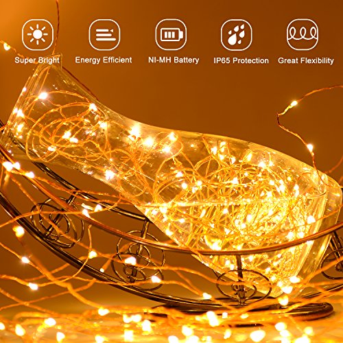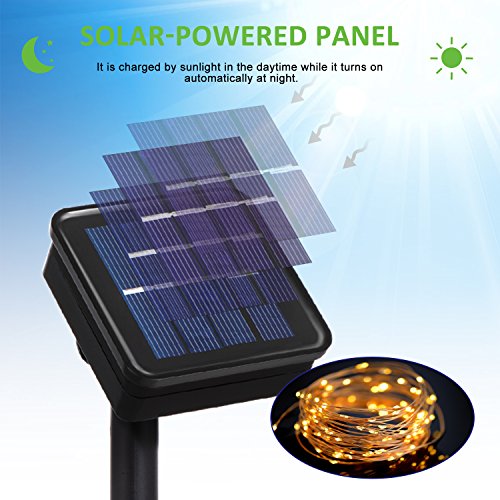 Solar-powered String Lights - No battery or outlets required, charged by the sunlight, energy-saving and eco-friendly. It can work up to 10 hours with a full charge. Auto on at dusk and auto off by day.