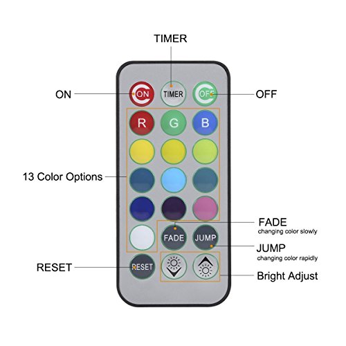 - 21-KEY VERSATILE REMOTE: Adjustable brightness, 13 individual colors for choosing, fade mode(Multi color gently fade), jump mode(joyfully auto-switch between 13 colors) and timer mode(6 hours on and 18 hours off), just one simple press will get your desired color and light mode all to your taste.