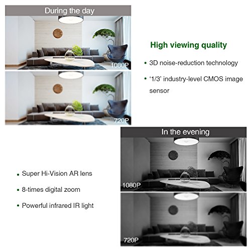 - Good viewing quality: CMOS image sensor, Hi-Vision AR lens and the smart HDR display technology, make images clearer; Moreover, it has 8-times digital zoom, recording in 1080p HD to capture clear images and corners in your rooms