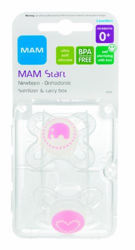 -. Binding : Baby Product -. Brand : MAM -. Color : Pink -. Department : baby-girls -. EAN : 0796629089686 -. Feature : Two BPA-free pacifiers, extra small and lightweight design / Curved shield allows the pacifier to sit comfortably on baby's face / MAM Ultra Soft Silicone Nipple stays comfortably in baby's mouth due to the anti-slip texture / Symmetrical nipple ideal for baby's jaw development / Textured surface and multiple small openings on the pacifier shield allow air to circulate and baby's skin to breathe -. IsAdultProduct : 0 -. Label : MAM -. Manufacturer : MAM -. Model : 0424-012-0-1 -. MPN : 0424-012-0-1 -. PackageQuantity : 1 -. PartNumber : 0424-012-0-1 -. ProductGroup : Baby Product -. ProductTypeName : BABY_PRODUCT -. Publisher : MAM -. ReleaseDate : 2013-08-13 -. Size : Newborn -. Studio : MAM -. Title : MAM Newborn Start Orthodontic Pacifier, Girl, 0+ Months, 2-Count -. UPC : 845296004246