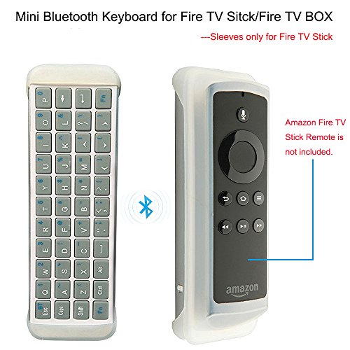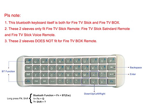Comes with two silicone sleeves, you can combine the keyboard and the Fire Stick Remote together into a single unit and no more losing remote controls! There are two different sleeves,one is for Fire Stick standard Remote, another for Fire Stick Voice Remote. They does NOT fit Fire TV BOX.