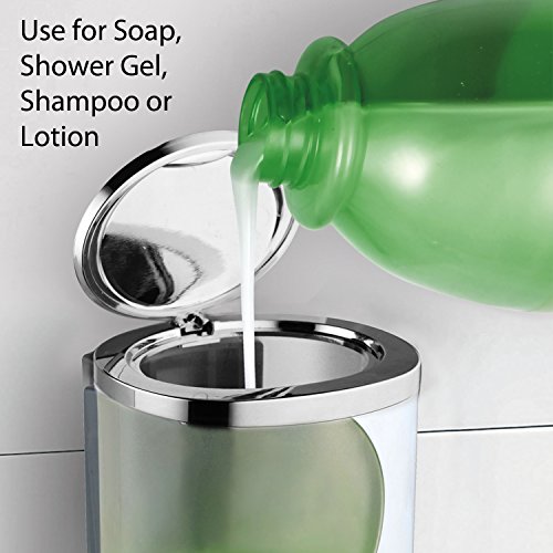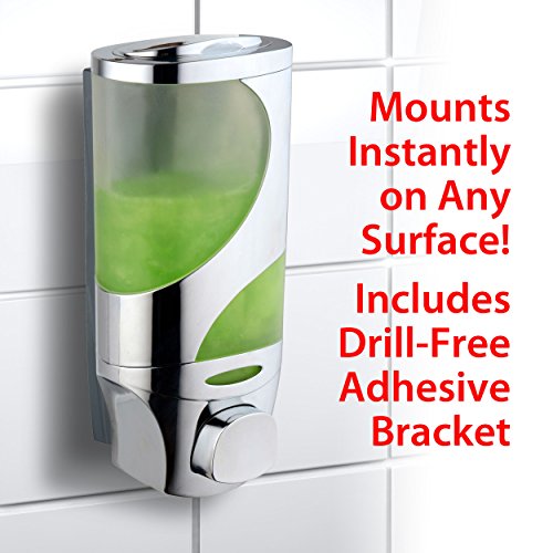SOAP DISPENSER: Mounts Instantly on Any Surface • Use for Shampoo, Soap, Shower Gel or Lotion • Shatter Resistant Clear Container • Ergonomic Oval Profile • Instant Mount Bracket includes Waterproof Adhesive Tape and Optional Use Screws / Anchors • Removable for Easy Cleaning • Easy Refill Flip Top • Generous Fill Capacity • Premium Chrome Finish • Patented Wave Design • Low Level Indicator • Anti Clog Push Pump