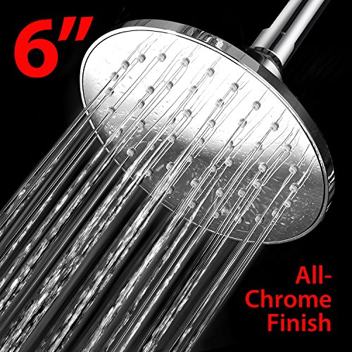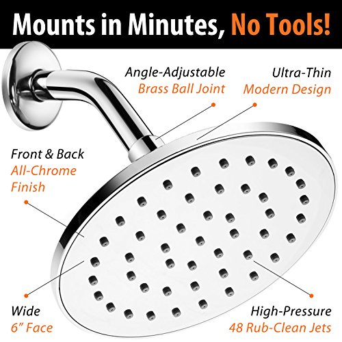 RAIN SHOWER HEAD: Maximizes Water Pressure • Wide 6-inch Face • Front and Back All Chrome Finish • Angle Adjustable Brass Ball Joint • Ultra-Thin Modern Design • High Pressure • 48 Rub Clean Jets • Mounts in Minutes, No Tools Necessary • Wider Water Flow Coverage • Amazing High Pressure • Wall Mount • Indoor and Outdoor Use • Modern Bath Spa Fixture