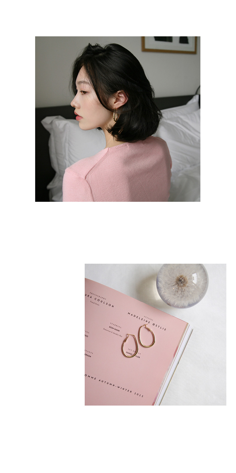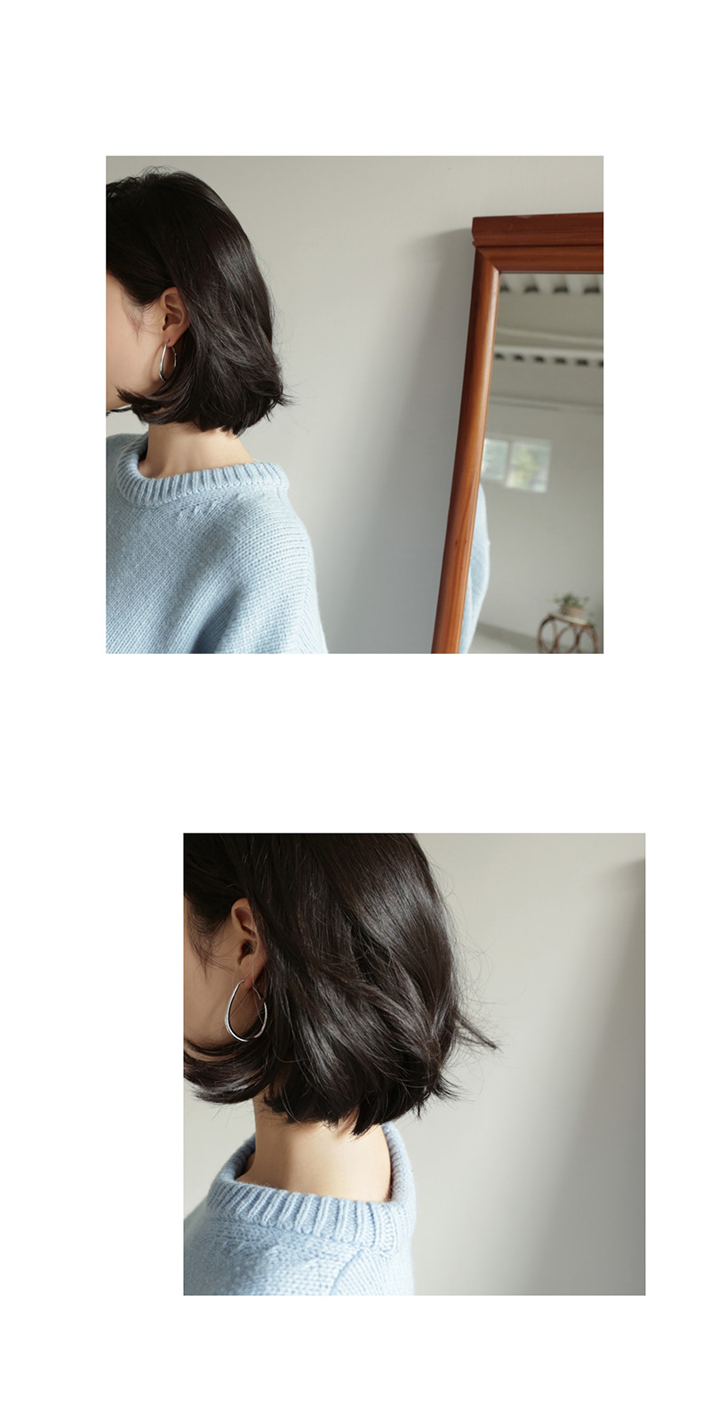 프렌치 무드를 완성시켜 줄 링 귀걸이입니다. 물방울 라인을 따라 떨어지는 우아한 곡선이 고급스러우며