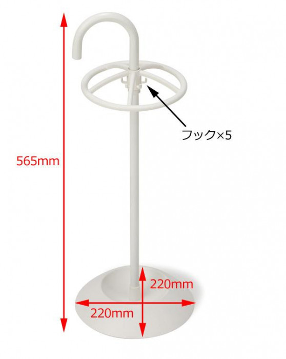 | 傘をしまうと、まるで花を咲かせたような逆円錐形になる、可愛らしいデザインです。傘立て自体を傘に見立てた取手は移動の際に便利です。内側の5本のフックには折りたたみ傘を掛けられます。 |