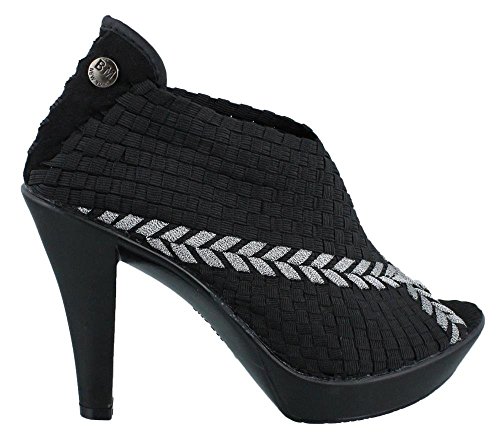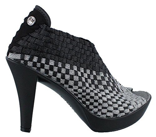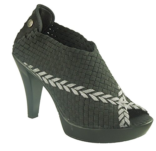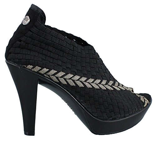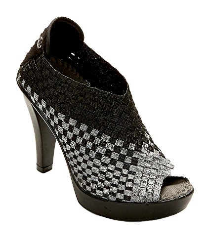 Enhance your style in these basket weave stretch elastic pumps, European shoe sizes. See size chart for U.S. conversion. Peep toe and metallic sheen adds an edgy look, 4'' rubber heel with a 0.75'' platform. Comfort feature: Memory foam footbed bernie mev., Style Number: HELENA.Feature