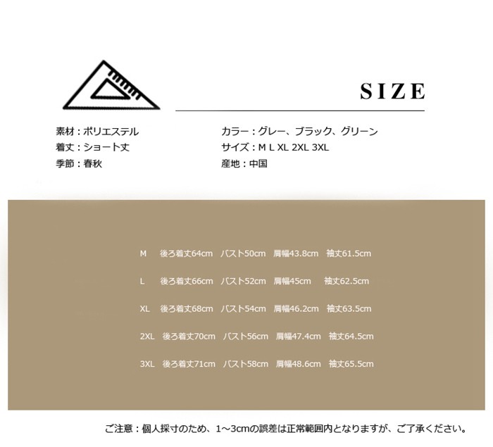 マウンテンパーカー メンズ ジャケット メンズ ショート丈 無地 大きいサイズ ゆったり 春コート トップス 撥水 アウトドア 2018新作登場 ブルゾン 大きいサイズ メンズ 春アウター ジャケット メンズ商品詳細素材:ポリエステル着丈:ショート丈季節:春秋カラー:グレー、ブラック、グリーンサイズ:M L XL 2XL 3XL産地:中国サイズ参照表M 後ろ着丈64cm バスト50cm 肩幅43.8cm 袖丈61.5cmL 後ろ着丈66cm バスト52cm 肩幅45cm 袖丈62.5cmXL 後ろ着丈68cm バスト54cm 肩幅46.2cm 袖丈63.5cm2XL 後ろ着丈70cm バスト56cm 肩幅47.4cm 袖丈64.5cm3XL 後ろ着丈71cm バスト58cm 肩幅48.6cm 袖丈65.5cmご注意:個人採寸のため、1~3cmの誤差は正常範囲内となりますが、御了承くださいマウンテンパーカー メンズ ジャケット メンズ ショート丈 無地 大きいサイズ ゆったり 春コート トップス 撥水 アウトドア 2018新作登場 ブルゾン 大きいサイズ メンズ 春アウター ジャケット メンズ