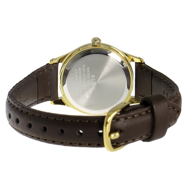 クオーツ、日常生活防水、カラー:ゴールド(文字盤)、ダークブラウン(ベルト)