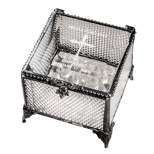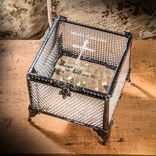 -. Feature : Tiffany styled stained glass keepsake box with clear cube glass beveled top and filigree trim / 'Cross' and 'Baptized' constant personalize free with name and date / Used to display your jewelry, trinkets and keepsakes / Handcrafted stained glass keepsake box made with lead free solder to protect you and the environment / Designed and Manufactured by J Devlin 3 1/4" x 3 1/4" x 3 1/4"